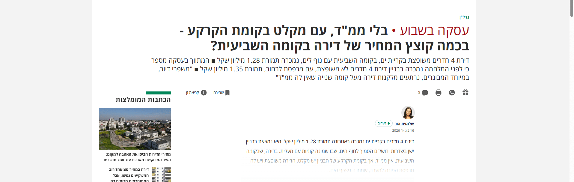 שלומי ליווה אותנו במכירה מורכבת של נכס מסחרי. היכולות שלו בניהול משא ומתן פשוט מרשימות. הוא הצליח להביא עסקה מצוינת בזמן קצר יחסית. תודה ענקית על השירות המקצועי והמסור.